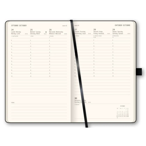 Realizzato con carta Natural FSC® da 80 g/m² di alta qualità , questa agenda dispone di 160 pagine stampate a un colore, disponibili in 4 lingue: italiano, inglese, tedesco e francese. Il segnalibro in raso integrato ti permetterà di tenere sempre sotto controllo la settimana in corso.