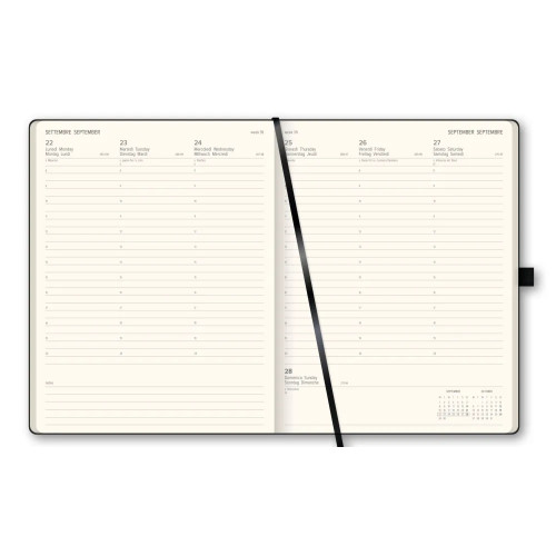 Quest'agenda è multilingue, con le informazioni disponibili in italiano, inglese, tedesco e francese, rendendola adatta anche per chi ha impegni internazionali. La stampa a un colore conferisce un tocco di eleganza al prodotto, mentre la chiusura con elastico e il segnalibro in raso integrato lo rendono pratico e comodo da utilizzare ogni giorno.