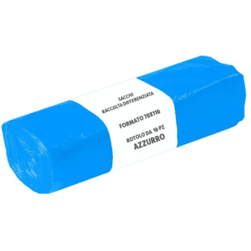 Sacchi immondizia per rifiuti inorganici. Dimensioni: 70 x 110 cm. Capacità: 110 litri. Colore: azzurro. Disponibili in rotolo da 10 pezzi.