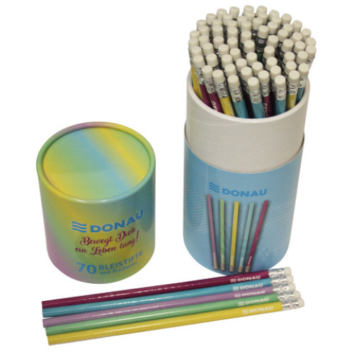 Questo barattolo contiene 70 matite con gommino, adatte per scrivere, disegnare e prendere appunti. Le matite sono dotate di grafite di grado HB, che consente di ottenere linee chiare e definite. Il fusto è colorato e disponibile in 5 tonalità assortite: giallo, verde, lilla, azzurro e porpora