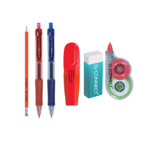 - Contenuto: 2 penne a scatto, 1 matita, 1 colla stick, 1 blocco di foglietti, 1 nastro adesivo, 1 evidenziatore, 1 correttore a nastro, fermagli colorati
